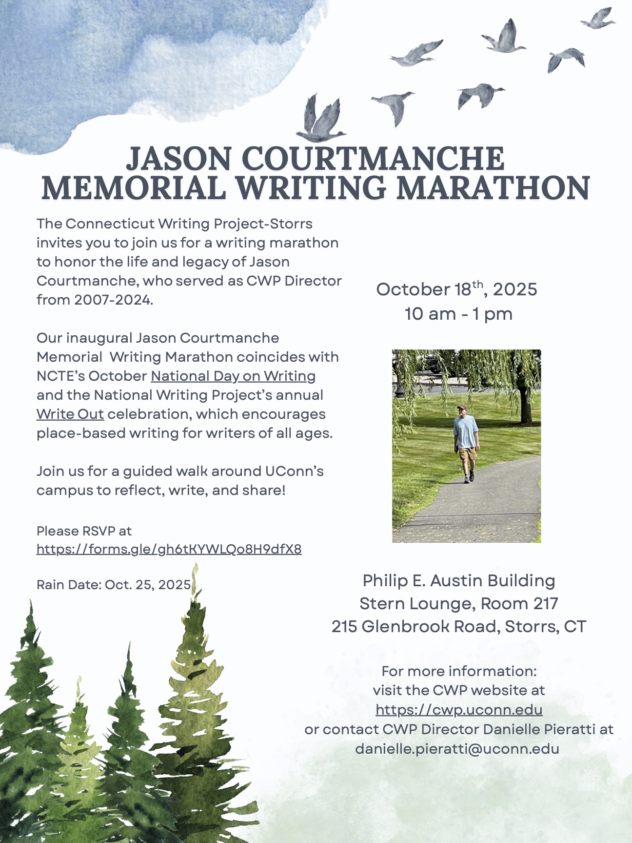 The Connecticut Writing Project-Storrs invites you to join us for a writing marathon to honor the life and legacy of Jason Courtmanche, who served as CWP Director from 2007–2024.